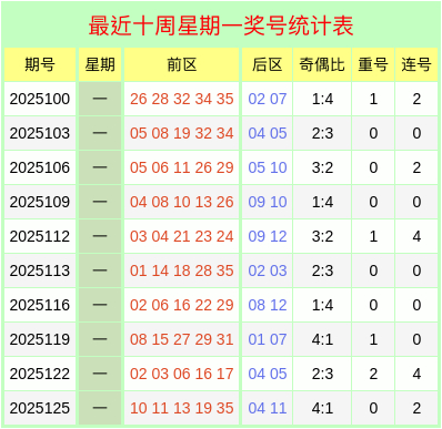 本期在星期一进行开奖,根据上方【最近十个星期一奖号统计表】可知,上周一前区奖号为10、11、13、19、35,奇偶比为4:1,最近十个星期一开出的前区奇偶比为23:27,本周一预计奇偶比为3:2。