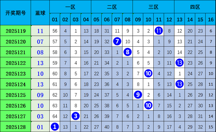 蓝球四区分析:上期蓝球号码01为小奇数号码,近10期大小总比为6:4,大码蓝球出号较热;10期内出现在四区比为2:2:4:2,3区出号较热;预测本期蓝球号码会出现在2区,独蓝推荐08。
