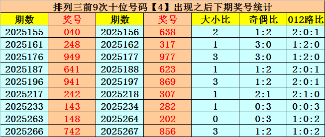 在十位前9次出现号码4后,其下期奖号分别开出:3-1-7-2-6-0-8-0-5,其中奖号个数大小比是4:5,012路比是4:2:3,奇偶比是4:5。