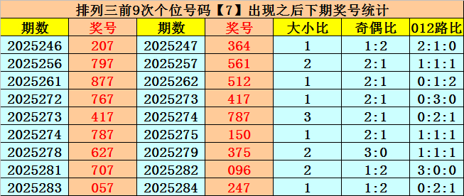 个位前9次开出号码7时,该位下期奖号分别为:4-1-2-7-7-0-5-6-7,其中号码个数奇偶比是5:4,大小比是5:4,012路比是2:5:2。