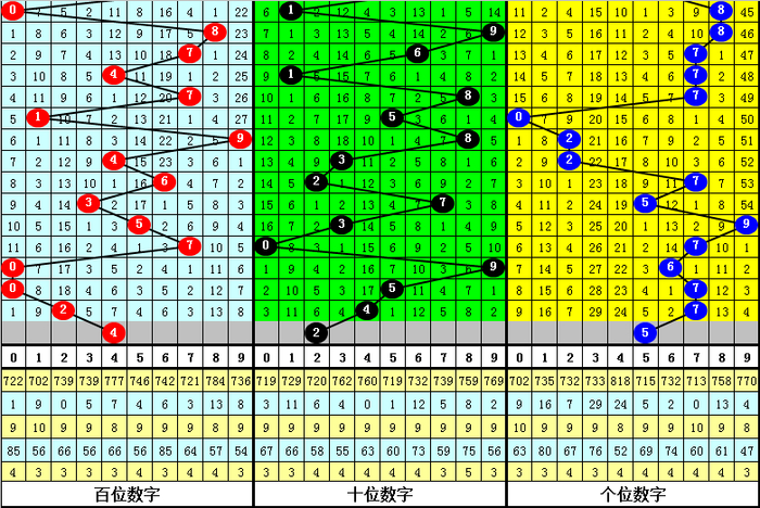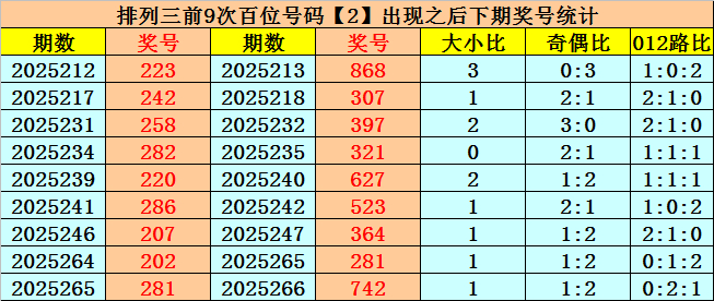 在百位前9次出现号码2之后,下期百位分别开出奖号:8-3-3-3-6-5-3-2-7,其中开出号码个数012路比是5:1:3,奇偶比是6:3,大小比是4:5。