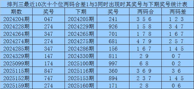 从以上统计可以看出,十个位两码合差1与3同时出现之后其下期两码合差表现最热的4个分别为:1267,本期十个位两码合差可以参考这四码中的数据。