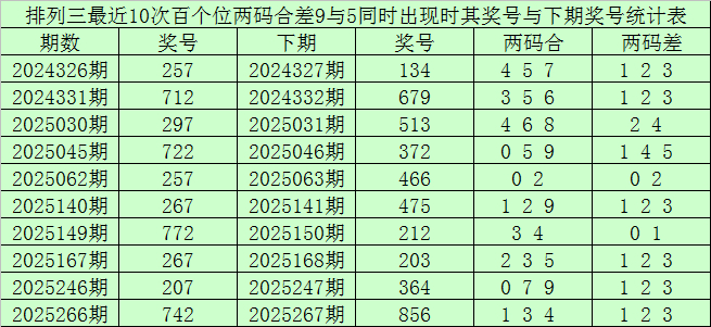 百个位合差分析:上期奖号百个位开出27组合,两码合为9,两码差为5,最近10次百个位两码合9与两码差5同时出现时,其奖号和下期奖号分别为: