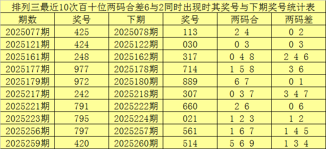 百十位合差分析:上期奖号百十位开出24组合,两码合为6,两码差为2,最近10次百十位两码合6与两码差2同时出现时,其奖号和下期奖号分别为: