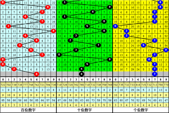 从以上统计可以看出,百十位两码合差6与2同时出现之后其下期两码合差表现最热的4个分别为:0136,本期百十位两码合差可以参考这四码中的数据。
