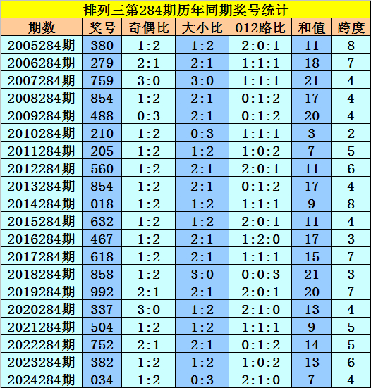 本期为排列三第2025284期开奖,历史上排列三第284期已开出了20期奖号了: