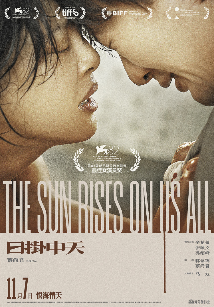 另一部同样入围威尼斯电影节的《日掛中天》将在11月7日上映,辛芷蕾凭借此片中的精湛表演斩获威尼斯最佳女演员奖,为中国电影带来了新生代的惊喜。片中辛芷蕾与张颂文饰演一对曾经的恋人美云和葆树,分手7年后再度相遇,美云试图借冯绍峰饰演的角色展望未来,却发现自己深陷旧日漩涡,情与债的执念再度将所有人推向命运的十字路口。蔡尚君着力挖掘三人错综复杂的人物关系,情感处理隐忍克制,背后的秘密和结局令人震撼。辛芷蕾的表演突出,压抑和爆发的演绎展现了她在表演上的张力,“威尼斯影后”成为该片吸引观众的最大卖点。