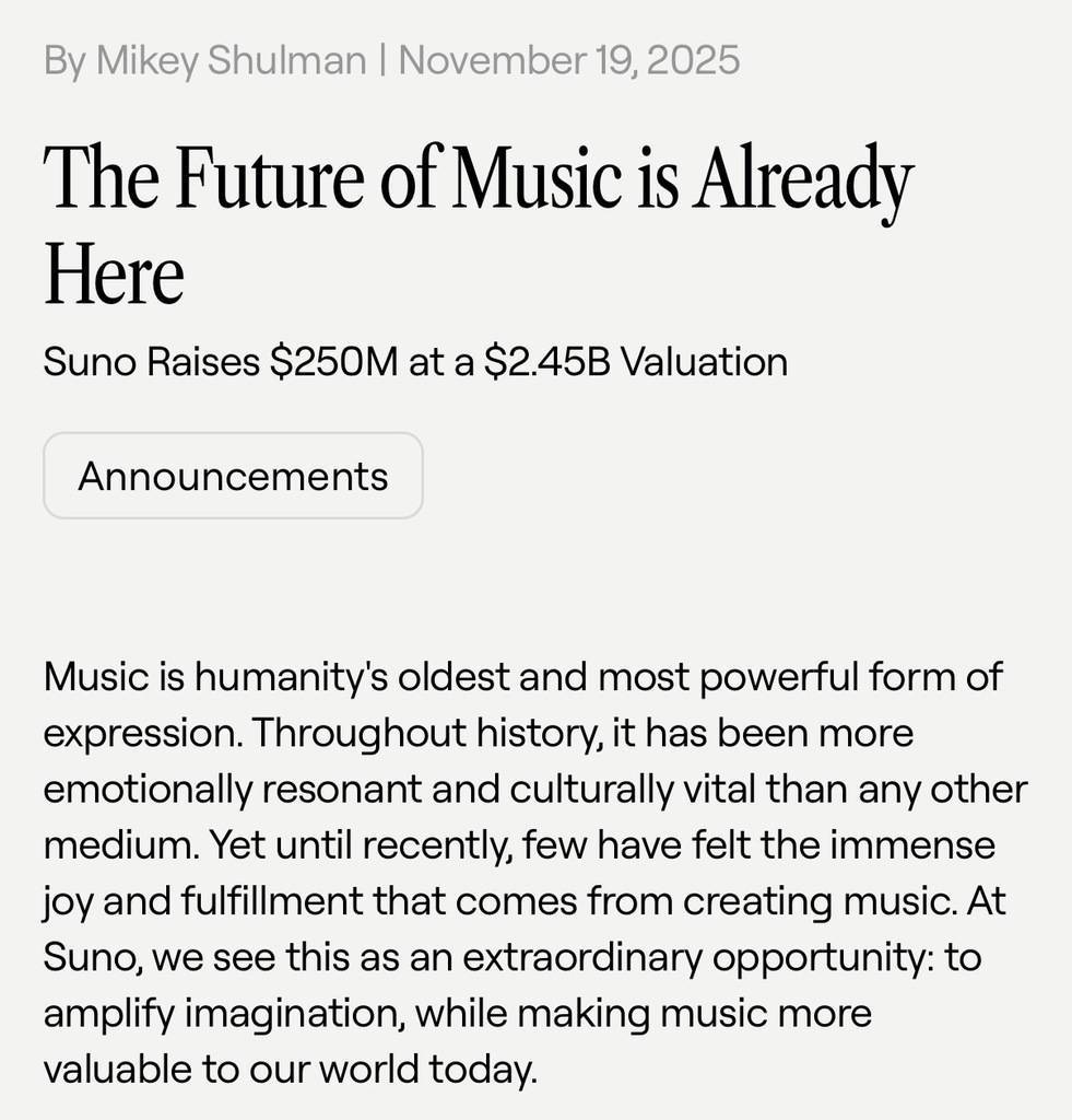 编译 | 王欣逸编辑 | 程茜智东西11月20日消息,昨晚,美国AI音乐创作平台Suno宣布完成2.5亿美元(约合人民币17.77亿元)的C轮融资,公司估值达24.5亿美元(约合人民币174.15亿元),较去年5月的5亿美元(约合人民币35.54亿元)估值翻了近五倍。据《华尔街日报》报道,Suno的年收入已达2亿美元(约合人民币14.22亿元)。