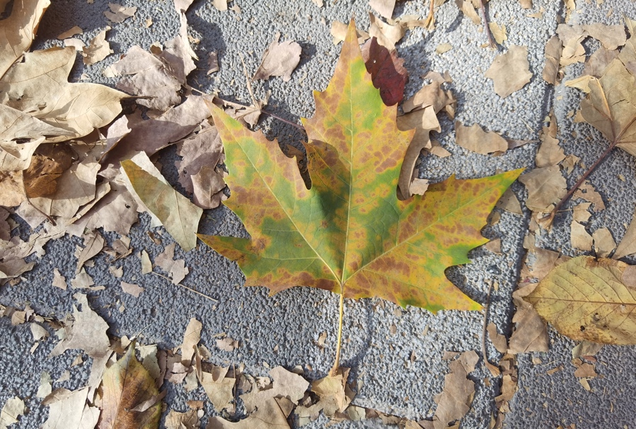 一片水灵多彩的悬铃木落叶,但其他落叶焦枯,主要与夏季持续炎热、干旱等因素有关。 陈玺撼摄