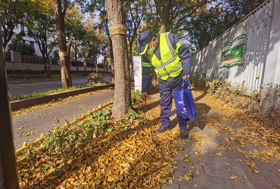 杨浦环境发展有限公司海真保洁分公司清道班的环卫师傅捡拾树叶“地毯”里的垃圾。 陈玺撼摄