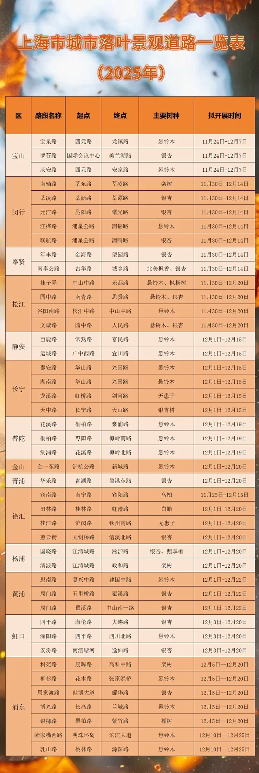 名单公布得晚,道路保留落叶的时间也启动得晚。和往年的11月上旬就启动相比,宝山区今天启动的3条“落叶不扫”道路已经是全市最早的3条,而浦东的陆家嘴西路(明珠环岛至滨江大道)、乳山路(桃林路至源深路)要到12月10日至12月25日才开启“落叶不扫”,是44条道路中最晚的两条。