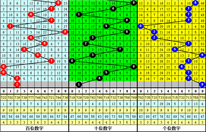 个位号码上期为7,质号,合号近期开出频次较低,当前遗漏2次,相对较冷,本期注意合号回补,关注9。