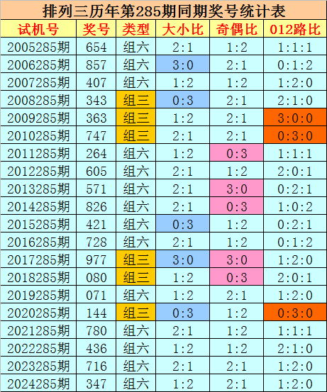 012路分析:历史上排列三第285期同期奖号中,012路奖号总个数比为20:27:13,012路奖号轮空期数比为6:4:10,今年第285期预计012路号码平衡出现,关注012路比1:1:1。