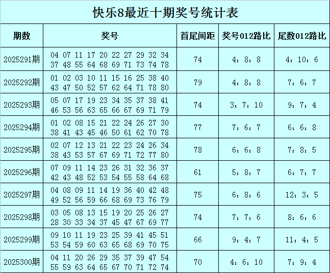 福彩快乐8第2025300期开出奖号:04 11 20 26 29 35 37 39 47 54 55 59 63 64 65 67 70 71 72 74最靠谱股票配资平台,其中奖号012路比为4:6:10,尾数012路比为7:9:4。