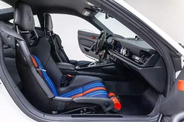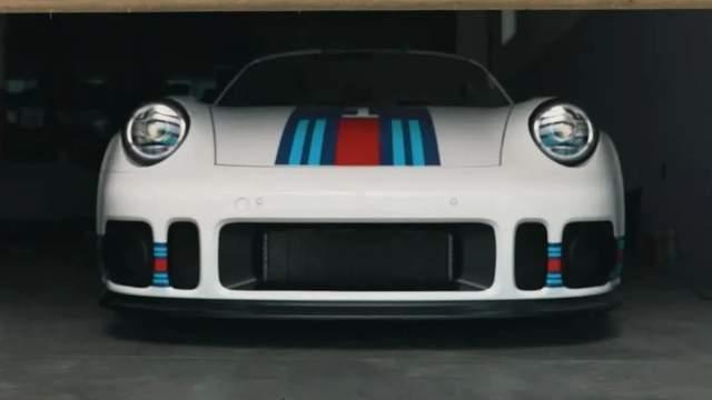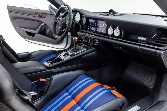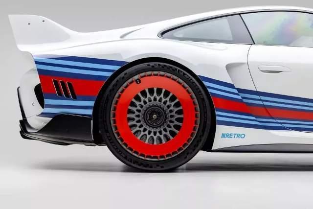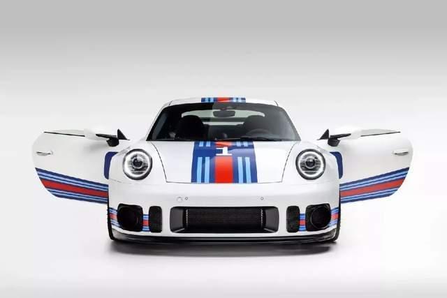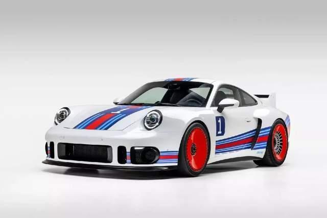 首发车型身披保时捷传奇的马天尼赛车涂装,白蓝红三色条纹贯穿车身,引擎盖与车门喷涂的“1”号标识瞬间唤醒1970年勒芒赛场记忆。但走近细看便会发现端倪:复古圆灯内嵌LED光源,熏黑格栅藏匿主动进气系统,23英寸锻造轮毂搭配红色空气动力学罩——这绝非老车修复,而是基于现款911底盘的彻底重生。
