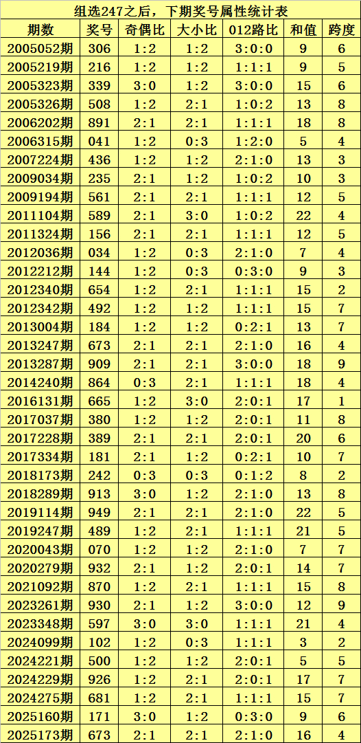 一、直选247分析:排列三最近3期分别开出直选号码:096历史出现次数为8次、057历史出现次数为7次、247历史出现次数为8次,本期注意历史上已开出8次左右的直选号码。