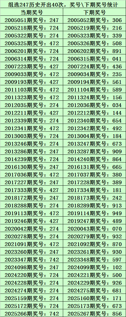 二、组选247分析:排列三历史上已开出40次组选号码247了,其奖号和下期开出奖号统计如下: