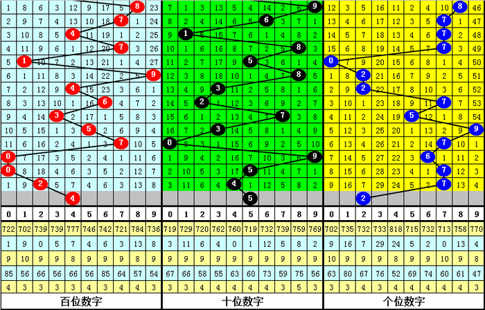 百位:近期大小 号码开出比例基本相当,小 号当前连续出现了3期,逐渐转热,本期看好该位小 号继续热出;另外,该位0路和1路号码在最近18期奖号中走势较热,2路号码表现相对较冷,本期该位放弃2路号码,参考号码4。