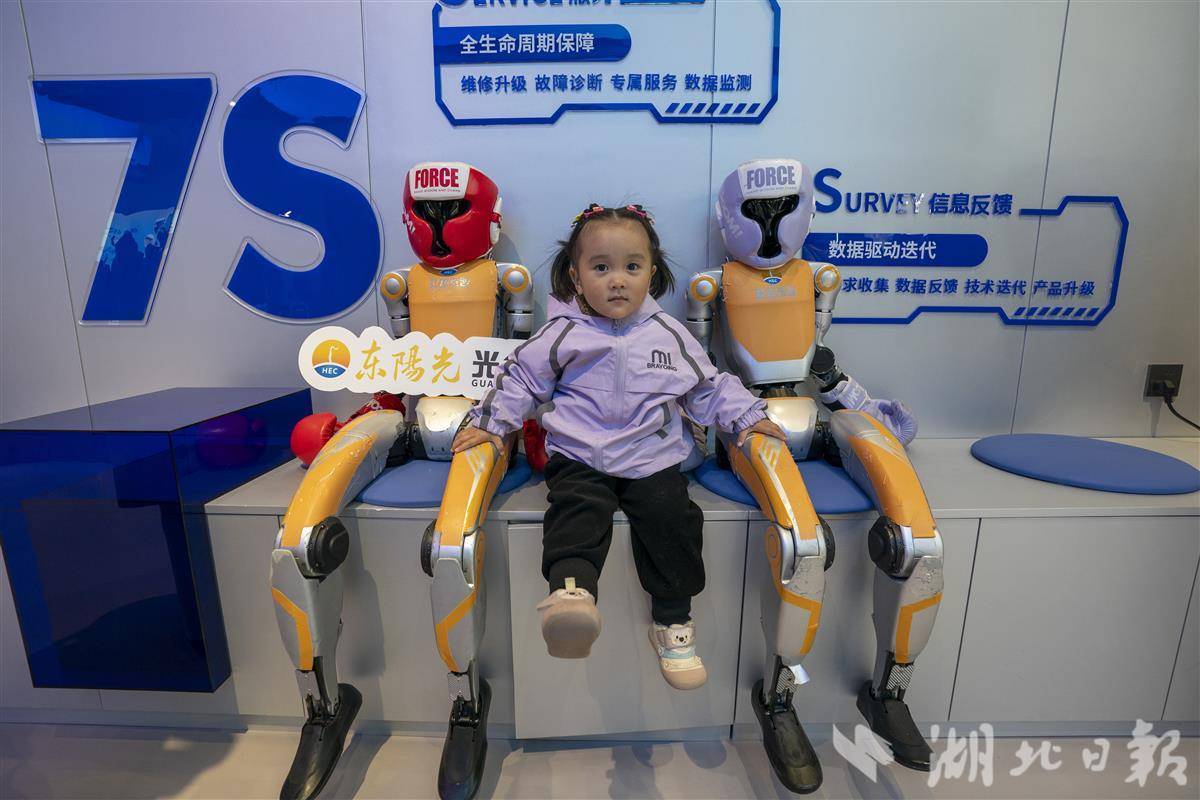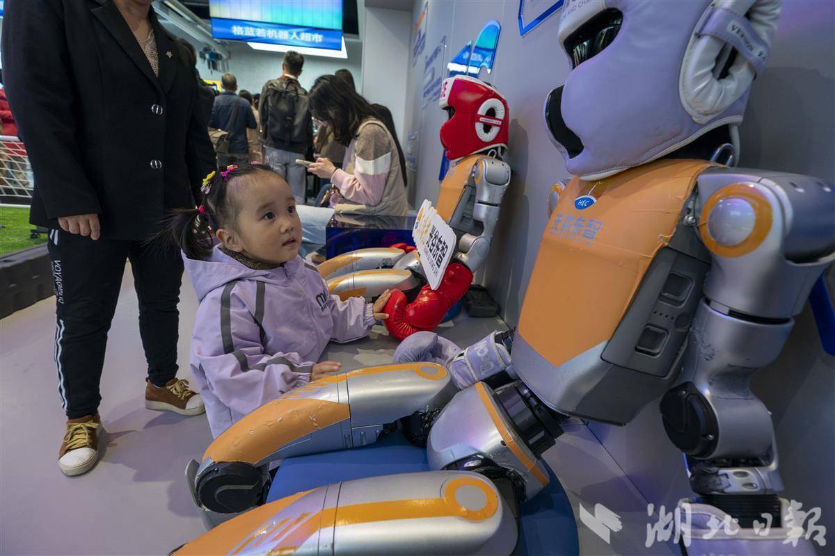 小朋友与机器人7S店里的机器人亲密接触。 (湖北日报全媒记者 魏铼 摄)