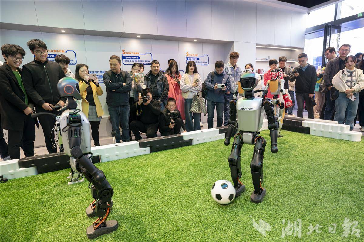 机器人7S店内,两个机器人在踢足球。 (湖北日报全媒记者 魏铼 摄)